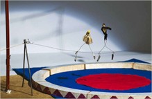 Arriving in Paris in 1926, Calder wanted something to announce himself in art circles. He came up with a miniature circus, a work now enjoying a 100th anniversary show. Charm is not its only quality. It shows his interest in movement and his facility with wire, thus foreshadowing his sinuous wire portraits and mobiles. His circus has a whimsical quality much appreciated by art critics of the time. And, with performances that could go for two hours, “Cirque Calder predated performance art by forty years.”
