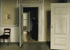 Hammershøi was taciturn, and don’t his paintings reflect it! Most were painted inside his Copenhagen apartment, showing sparsely furnished rooms, open doors, the occasional figure (often his wife) with her back turned, all painted in “dour colours” and conveying “emotional weight”. One writer likens them to Vermeer but with “none of the narrative drive”. Hammershøi did a few landscapes of the Danish countryside. In some the sun breaks through but, like his interiors, there isn’t much warmth.